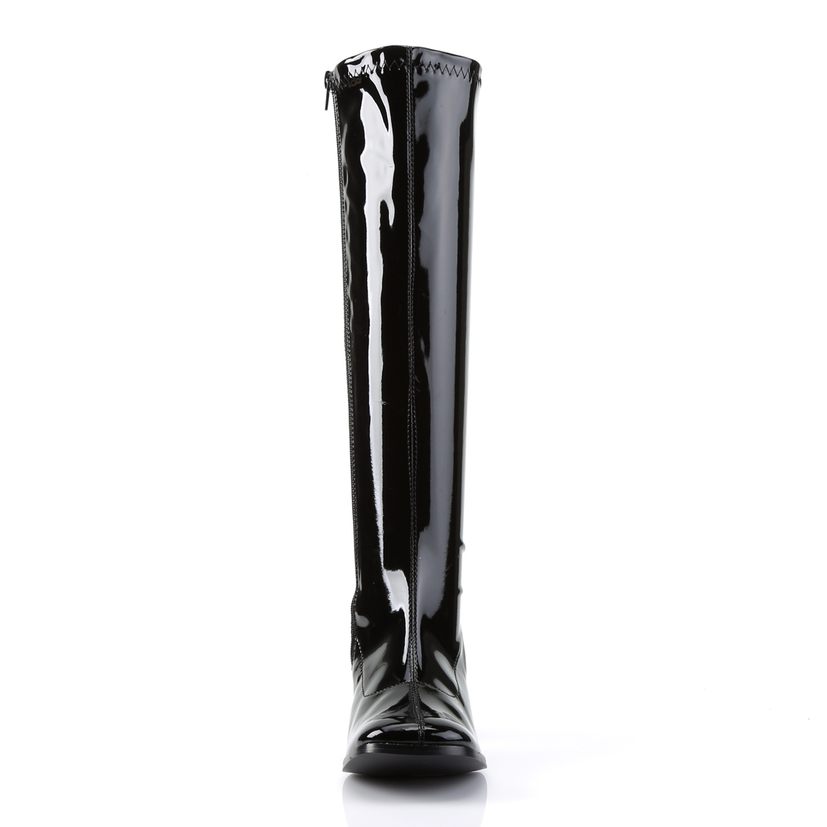 Für alle Lackstiefel Liebhaber, die es gerne etwas bequemer haben. Die GOGO 300 haben einen breiten Blockabsatz mit ca. 3" also etwa 8,5 cm Höhe, der Fuß ist vorne etwas breiter geschnitten, so daß die Schuhe auch nach langem Tragen nicht drücken. Mit bequemem Stretchlackschaft mit Innenreißverschluss.