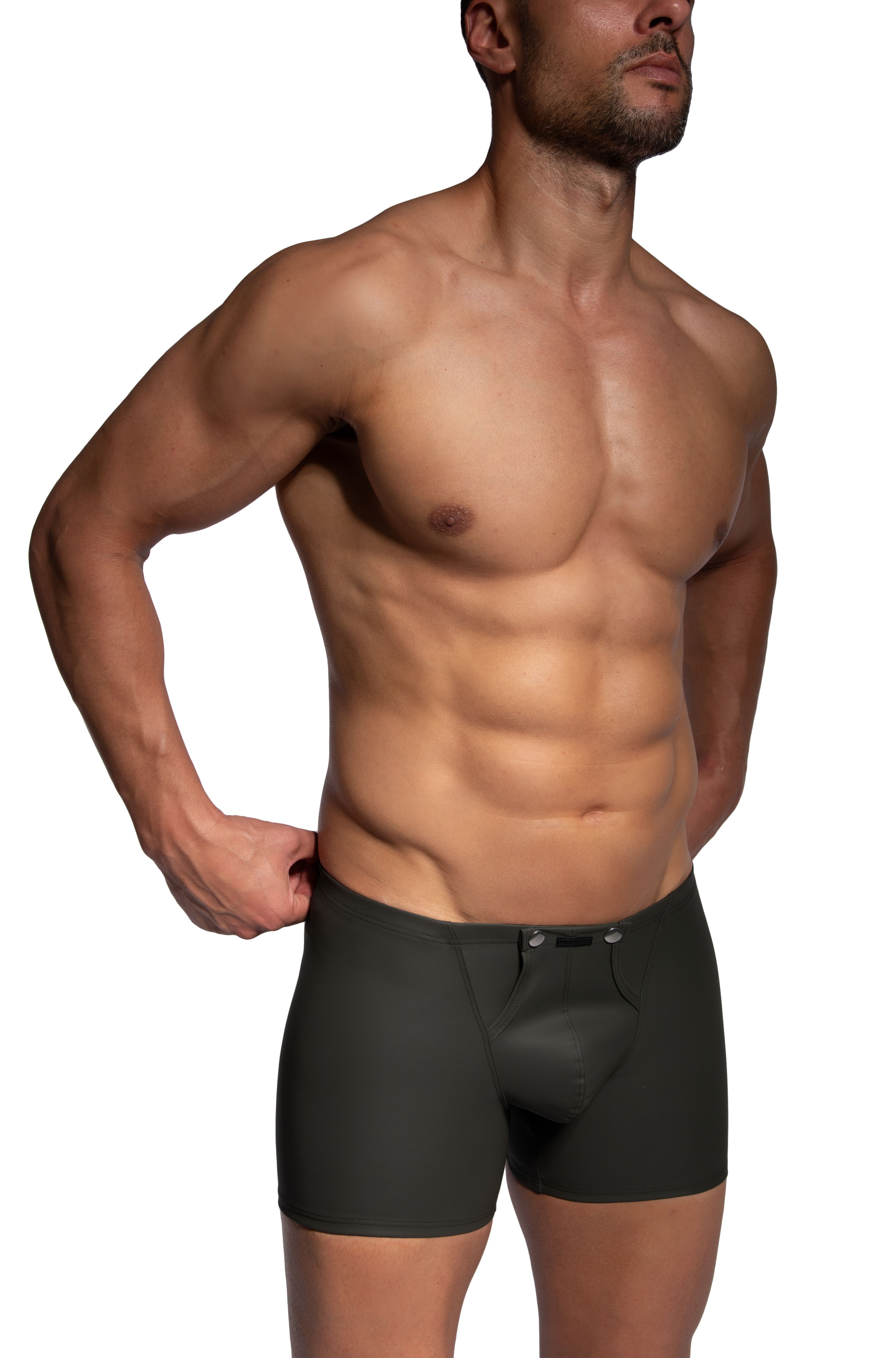 Olivgrüne Popper Boxershorts aus dem Hause Manstore. Toller Schnitt mit Popper Öffnung mit Druckknöpfen. Das kühle, matte Material fühlt sich von außen etwas wie Neopren an. Sehr erotisch. In dezentem Olivgrün.