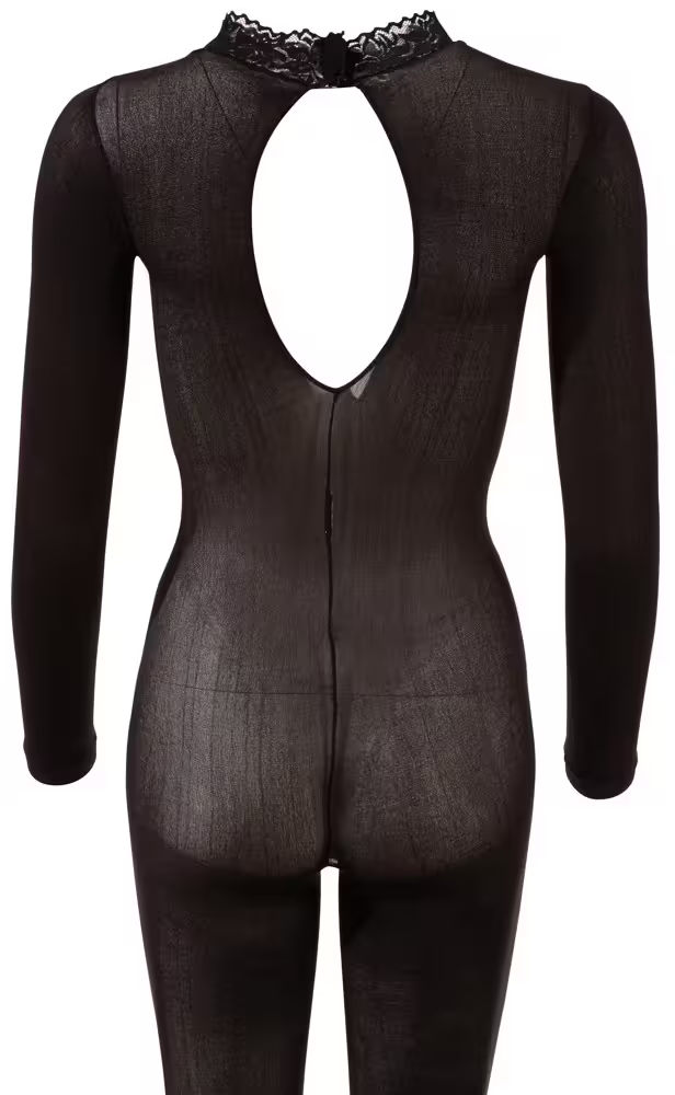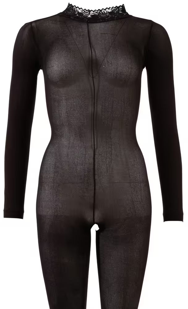 Hochgeschlossen und doch supersexy. Transparenter Catsuit aus Polyamid. Mit Spitzenrand am Hals (mit Druckknopfverschluss hinten). Im Schritt offen.