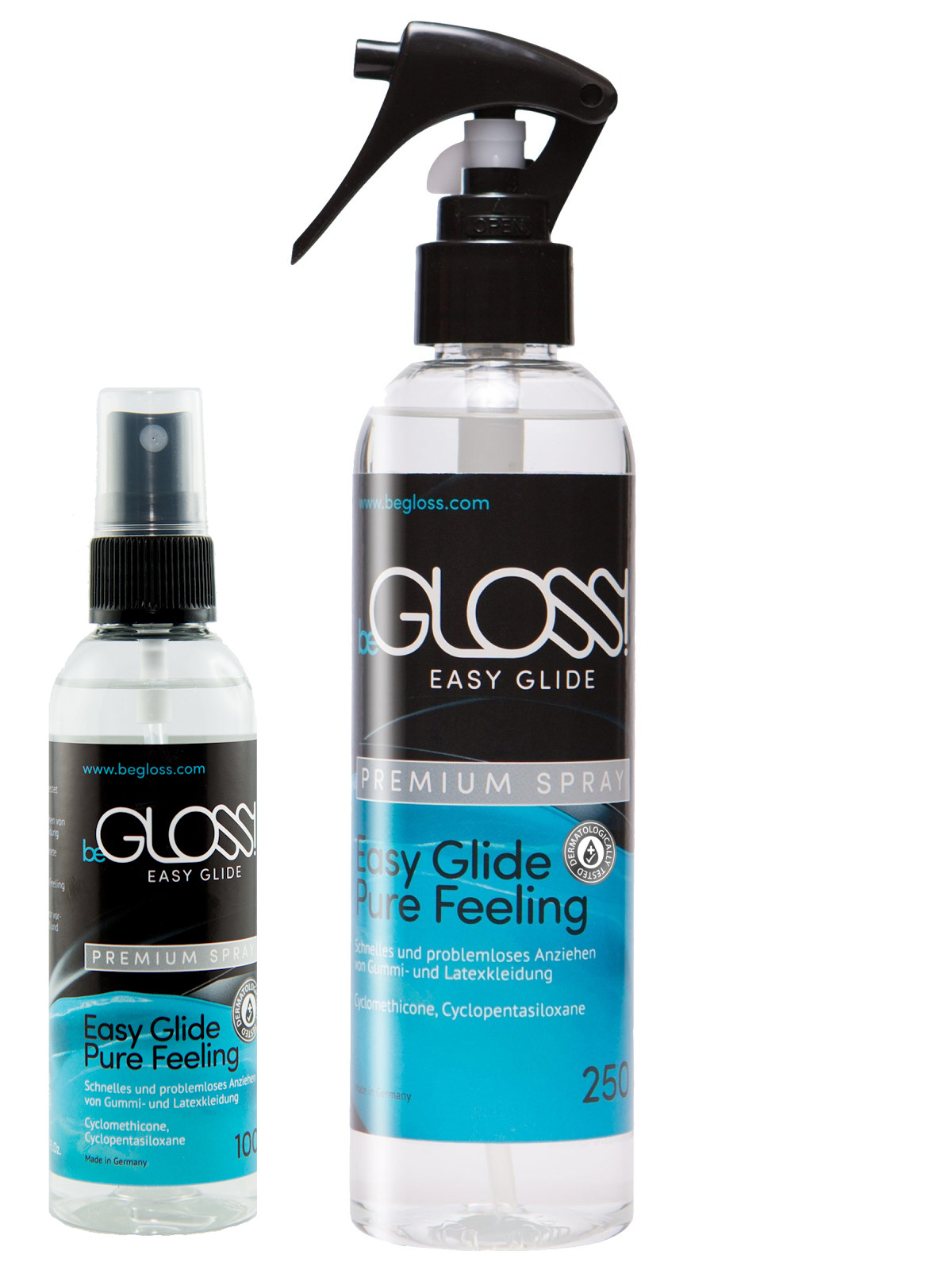 beGLOSS EASY GLIDE PREMIUM SPRAY - Easy Glide - Pure Feeling - Diese Latex PREMIUM Anziehhilfe pflegt und verteilt sich viel schneller und wesentlich besser wie normales EASY GLIDE durch die besonders dünne Viskosität verbraucht man wesentlich weniger.
